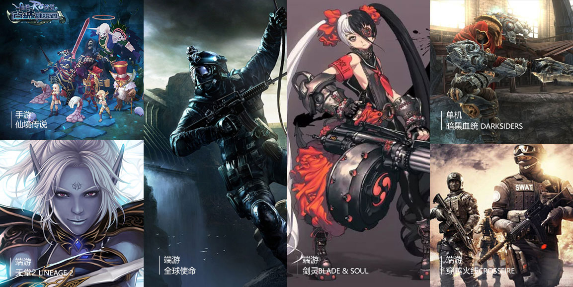 《穿越火線》、《天堂2》、《地獄之門》、《暗黑血統(tǒng)》、《全球使命》、《戰(zhàn)爭機(jī)器資料篇》、《劍靈》等項目。